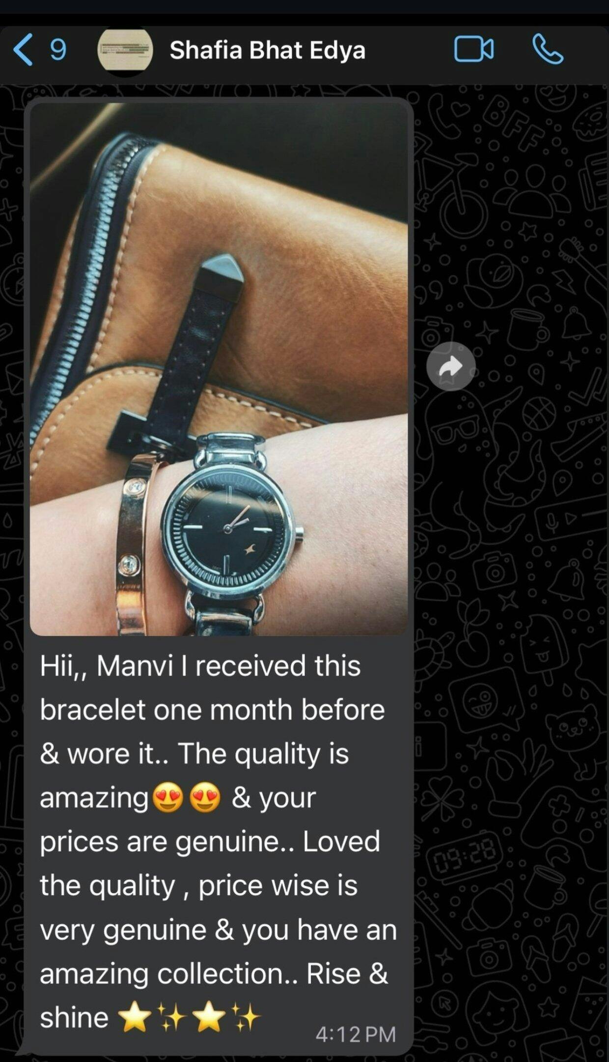 Shafia bhatt I received this bracelet one month before and wore it! The quality is amazing, and your prices are genuine. loved the quality! Price-wise, it's very genuine, and you have an amazing collection. Rise and shine!